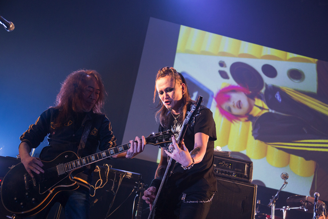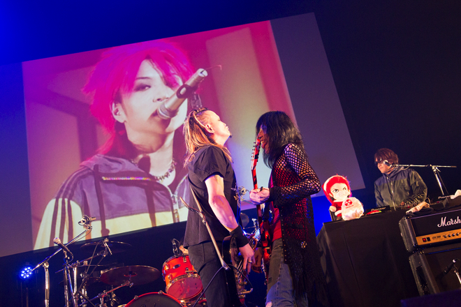 そして最後は恒例のセッション。幕が上がるとステージ上には、KIYOSHI、CHIROLYN、DIE、JOE、INAの5人が立っている。CHIROLYNが「一人足りないと思わない?」と観客に問いかけると、間髪入れずにPATAコールが沸き上がる。下手からPATAが手を振りながら出てきて、hideバンドのメンバーが揃った。「ROCKET DIVE」のイントロが始まると銀テープが会場に放射。バックのスクリーンからhideの映像と歌声が聞こえてきて、ステージ上の6人とスクリーンのhideがシンクロして会場を盛り上げている。さらに銀テープと赤い髪のhide人形を振る観客も加わって、会場はあたたかい一体感に包まれた。