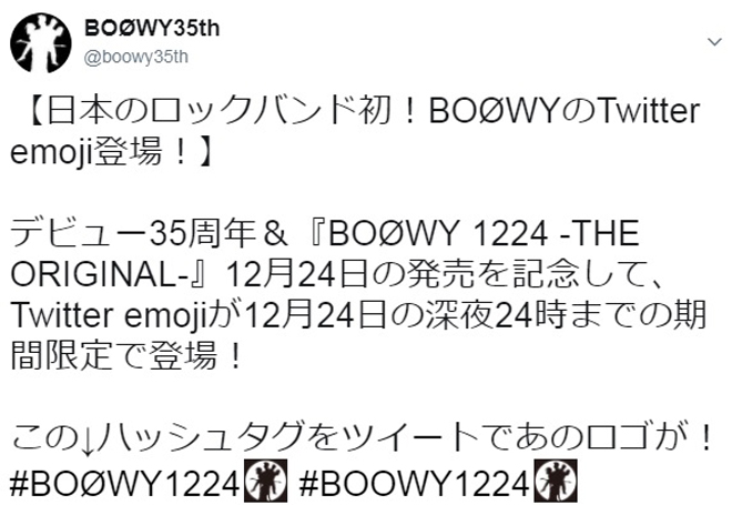 これは12月24日に映像作品『BOOWY 1224 -THE ORIGINAL-』がリリースされることを記念したもの。Twitter Emojiとは、Twitterでツイートを投稿する際に特定のハッシュタグの後に自動的に表れる絵文字のようなアイコンで、海外アーティストではザ・ローリング・ストーンズの11年ぶりの新作アルバム『ブルー&ロンサム』のリリース時に青ベロのアイコンが、フレディ・マーキューリー(クイーン)の生誕70周年の時にフレディの姿のデザインが登場した。また日本発のものとしては、『紅白歌合戦』や2017年の衆議院選挙、『ドラゴンクエスト』30周年を記念したデザインなどがある。