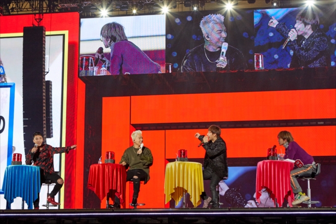司会には古家正亨氏を迎え、メンバー4人の爆笑トークセッションやBIGBANGデビュー当時の映像をクイズ形式で振り返るコーナー、そしてイントロドンなどのゲームコーナーに加が用意され、彼らの素顔を垣間見ることができた。ゲームコーナーではムービングステージがアリーナ中央まで移動するなど、より多くのファンとふれあう機会を設けたいというメンバー達の意向がダイレクトに反映されていた。