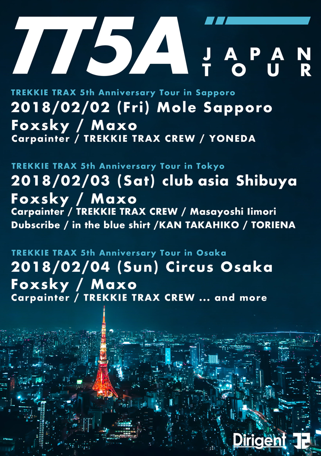 さらに5周年を記念し、2018年2月3日(火)にclub asiaにて<TREKKIE TRAX 5th Anniversary Party>の開催も決定した。2017年にツアーを行い、TREKKIE TRAXのパーティーで過去最大の観客を動員した、アメリカ・ロサンゼルス在住のアーティスト“Foxksy”と、2017年10月に同レーベルより「Maxo – Skyriser」をリリースした“Maxo”がニューヨークより来日する。