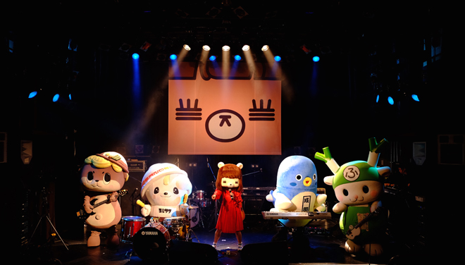 コレサワがリーダーを務めるコレちゃんズは、埼玉県深谷市・ふっかちゃん(G)、高知県須崎市・しんじょう君(B)、栃木県佐野市・さのまる(Dr)、千葉県成田市・うなりくん(Key)からなる5体(?)組バンド。ステージでは、「死ぬこと以外かすり傷 コレちゃんズver.」を初披露したほか、各メンバーの紹介も行なわれた。