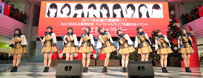 つばきファクトリー が12月15日(金)、池袋 サンシャインシティ 噴水広場にて『つばきファクトリー 2017年応援大感謝祭!!!スッペシャルライブ&握手会イベント』を開催し、イベント上で来年のワンマンライブ開催とニューシングルの収録曲名を発表した。