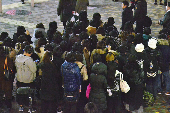この2バンドの上映会は以前も行われたが、そのときはかなり多くの人が集まった。だから今回も、さぞ早くから人が集まるだろうと思われたのだが、映開始時刻の30分前になっても、西武新宿駅前ペペ広場に設けられた視聴エリアは半分ほど埋まる程度。意外に出足が鈍い、と思ったのもつかの間、開始直前になってどんどん人がやってきて、あっという間に視聴エリアは超満員となった。人気バンドが行なった超人気イベントの映像が見られる上映会だけに、人が集まらないわけがないのだ。