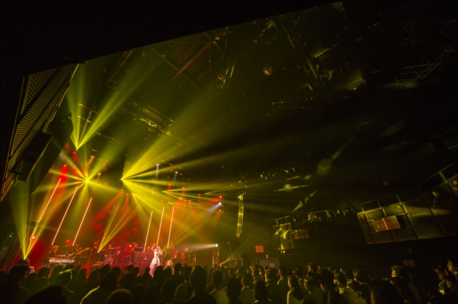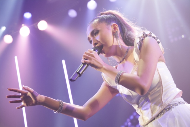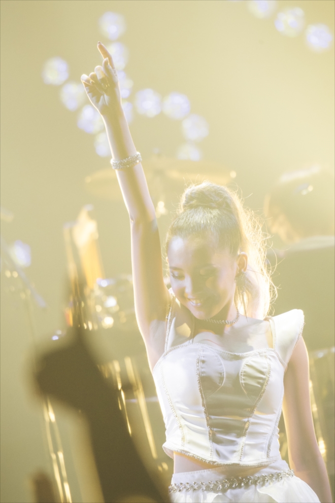 オープニングは「Tell Me Baby」。ファーストアルバム『AWESOME』の1曲目を飾るパワフルなR&Bチューンを、とてつもない声量と圧巻のハイトーンで歌う。噂通り、いや噂以上にナマで聴く彼女の声は素晴らしい。ドラムにパーカッション、2台のキーボードにコーラスも加えたバンドのゴージャスな音圧に拮抗している。続けてファンク色の濃い「Too Much」へ、そして早くも「I need your love」を繰り出して一気に畳みかける。R&B、ファンクにさらにロックを加えたような、洋楽とJ-POPとのハイブリッド。セクシーなシルエットの白い衣装に銀の厚底ヒール、ポニーテールに束ねた髪、そして輝くようなキュートな笑顔で、マイクを持たない右手を「届け!」とばかりに客席に伸ばす。全身を使った元気いっぱいのパフォーマンスだ。