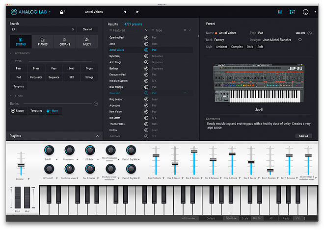 21種のインストゥルメントは、同梱される「Analog Lab 3」で集中管理、6,000以上のプリセット・サウンドにすぐアクセスできる。各プリセットは、最も重要なパラメーターがKeyLabやMiniLabなどのコントローラーに自動的にマッピングされるほか、MIDIラーン機能であらゆるコントローラーにパラメーターをアサイン、カスタム・マッピングもカンタンに行える。