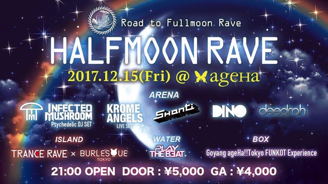 12月15日(金)、タイ・パンガン島発祥の音楽イベント“MOONシリーズ”の第2弾<HALF MOON RAVE>が新木場ageHaにて開催された。