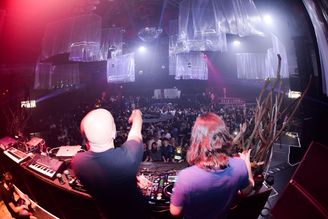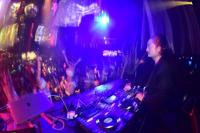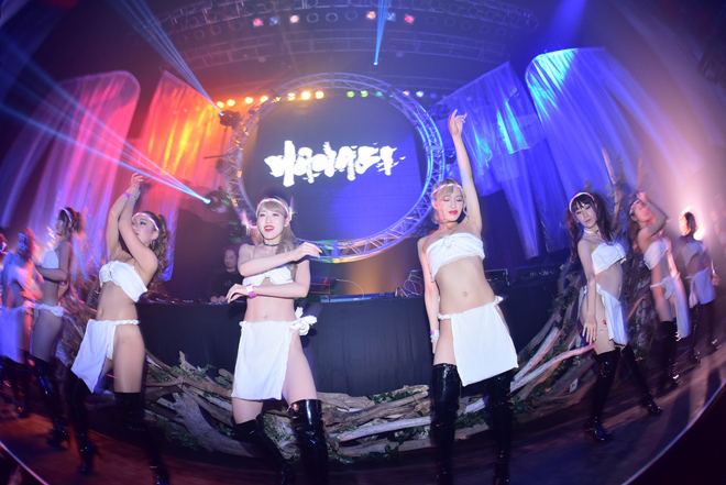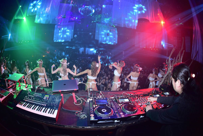 DJ KAYAをはじめ30分ごとに目まぐるしくDJが展開したのは「BURLESQUE TOKYO×TRANCE RAVE」がテーマの「ISLAND」。こちらはメイン会場以上に人が埋まっている状態で、それもそのはず、本場タイのゴーゴーバーでも行われているBARカウンターでのダンスショー&「クエルボバンバン」(テキーラ100杯=50,000円分をオーダーした人がいるとドラが鳴り響き、フロアにいるオーディエンスに振る舞われる)という企画が行われており、本場タイのゴーゴーバーを凌ぐエンターテインメントを遂げていた。界隈ではおなじみMC MAN(Burlesqueプロダクション社長にして、KAYAと共にパンガン島の息吹を持ち込んだ立役者)の掛け声とともに立て続けにドラが鳴り響いており、その度に拍手喝采が起こったのは言うまでもないだろう。