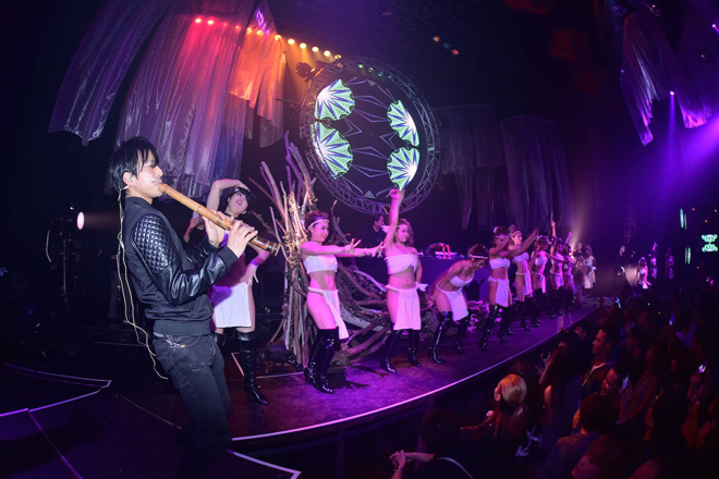 「ARENA」をメインフロアに据え「ISLAND」「WATER」「BOX」「STAR BAR」という多彩な5つのエリアが用意されていたが、DJ/ライブパフォーマンスのみならず、デコレーション、ショー、クエルボバンバン(後述)など、見所満載、心からお腹いっぱいのエンターテイメント空間が広がっていた。どこに行っても楽しめる!と思ったら、<FULLMOON RAVE>直前にインタビューを実施したDJ KAYA(2016年にパンガン島の<FULLMOON PARTY>でプレイした本イベントのプロデューサー)の言葉を思い出した。「すべてのお祭り好きの日本人が集まるイベントだと思ってください」──まさにそう。トランスだろうが、テクノだろうが、90’s R&B/ヒップホップだろうが、音楽のジャンルを超越して楽しめる“大人の遊園地”、そんな印象だ。