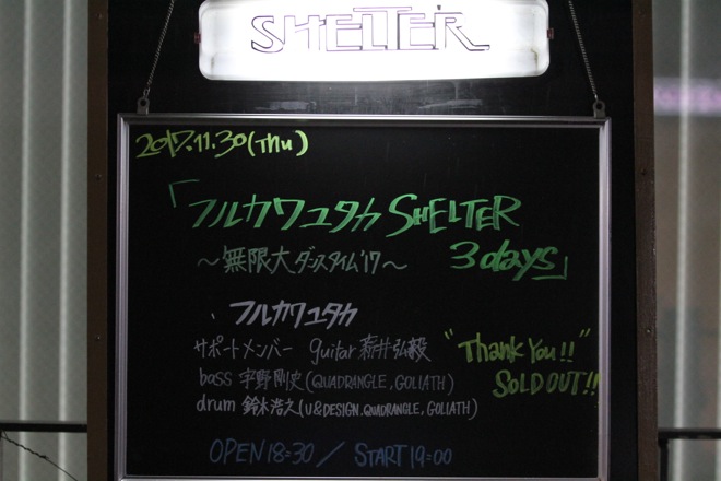 <フルカワユタカ SHELTER 3days>のテーマは、初日から「バック・トゥ・ザ・インディーズ」、2日目は「フルカワユタカはこう弾き語った」、最終日は「無限大ダンスタイム’17」。“ビート感の強く速いパンクチューン”目白押しの初日、“しっとり&激しいアコースティックライブ”の2日目、思わず身体が反応する“四つ打ちダンスロック”の最終日、といった日替わりメニューがフルカワならではの振り幅の広い音楽性を示す。その3日間の熱狂をお伝えする同レポートは、先ごろ公開した初日および二日目に続いて、最終日11月30日の<フルカワユタカ SHELTER 3days「無限大ダンスタイム’17」>へ。
