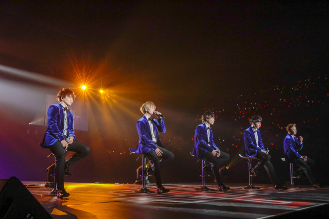 それから花村想太が「大切な楽曲」と紹介した次の曲は、インディーズ時代の楽曲をアレンジした「せつなくて -5 Voice & acoustic ver.-」。パフォーマーの工藤大輝、岩岡徹、和田颯がボーカルとして歌ったのはこの1曲のみで、サブステージで5人が椅子に座りながら順番に歌唱し、タイトルどおりの胸に染み入る切ない歌声で会場を包み込んだ。