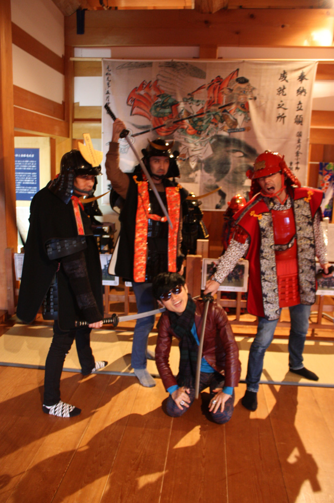 白石城の天守内では観光客用に鎧を着て写真を撮れるサービスがあり、外国人の観光客が群がっていた。せっかく我々も大勢で来たんだし、観光の思い出としてちょっとやってみるかということになり、メンバーのベーシスト鈴木賢二さん、ギタリストの生熊耕治さん、そしてローディーの伊藤直樹さんが鎧を着ることに。係のおじさんやおばさんに着付けをその場でしてもらい、写真も撮ってもらえるというシステム。我々は大はしゃぎ。一つ面白かったのはここの係のおじさんやおばさんが、我々に対して「どこの国の人?」と聞いてきたことである。確かに鈴木賢二さんは沖縄の血も入っていて外国人っぽくもありスペイン人に見えなくもない。生熊耕治さんは韓流顔負けのアジアンイケメンと言えなくもない。ローディの伊藤さんは移動日で若干髭を生やしていたこともあり、目も薄茶色、色白、鍛え抜かれた厚いボディーのおかげでイタリア系アメリカ人、シルベスタ・スターローン、いやロッキー・バルボアに見えたかもしれない。確かに生卵を8個余裕で一気飲み出来そうだ。ちなみにバルボアは5個である。どうでもいいわ。