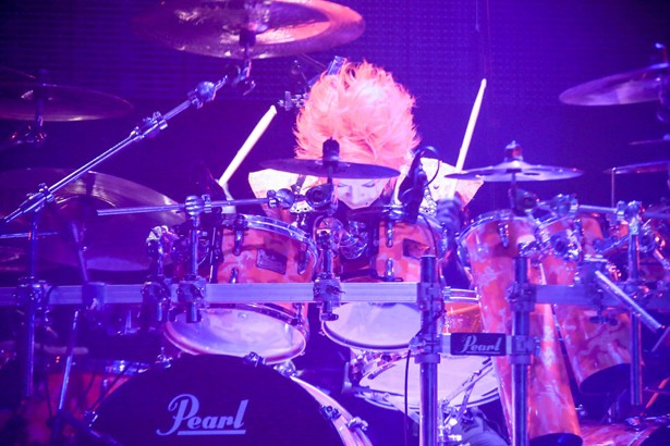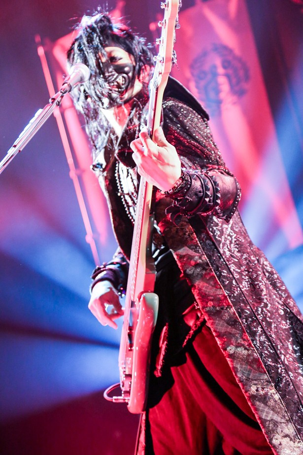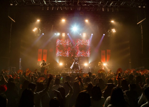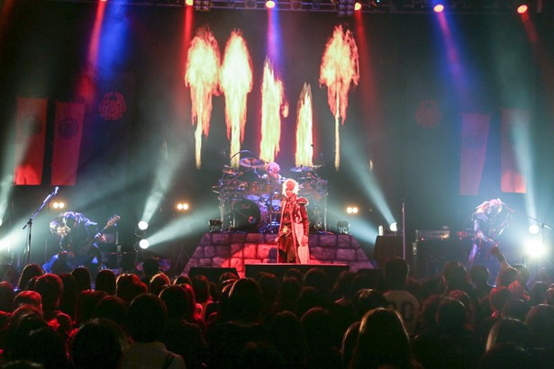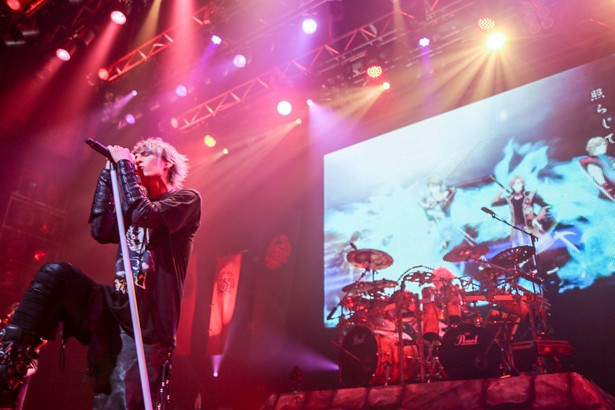 無数の軍旗がたなびくステージ。巨大なスクリーンに映し出されたイラスト姿のMANZOUが語った、「4人の初陣が素晴らしいものになることをみなさん見届けてください、いざ出陣!!」の声。煽るその声を受け、爆裂する炎の映像と荘厳な音に乗せ4人が姿を現した。S.N.Dのドラムセットはお城の土台の上に聳え立っている。なんて、らしい演出だ。