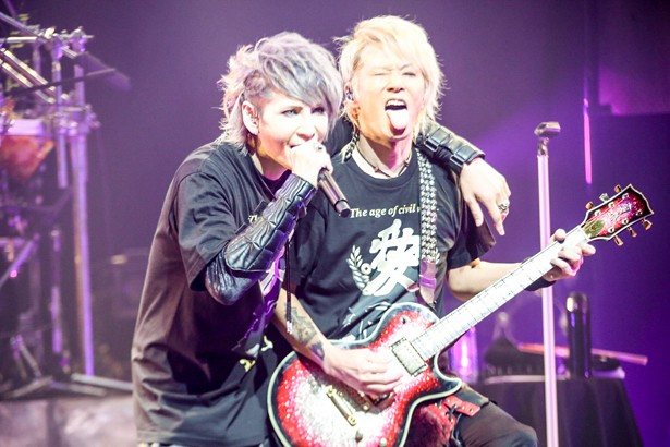 戦いも終盤戦へ。戦国時代-The age of civil wars-の真っ赤なロゴを背にぶつけたのが、嵐のごとく荒れ狂う音の旋風を巻き起こす「Wheter true or false」だ。熱い手拍子とともに熱狂はフロアー中へ広がってゆく。Nao-Aがタオルを手に頭上高く振りまわすと同時に、演奏は「愛染明王」へ。背景には直江兜が映し出されている。疾走するビートナンバーの上で、誰もが無邪気な戦士となり、刀の変わりにタオルを振りまわし、気持ちを一つに重ねあう戦いを繰り広げていた。