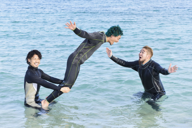 オープンカーで沖縄を駆け巡り、首里城や公設市場、真冬の海でのマリンスポーツ、そしてサーターアンダギー作り体験など、約半日のスペシャル旅行を楽しんだ彼ら。インタビューではもちろん、メジャー1stフルアルバムとなる新作『Everybody!!』についても語られる。