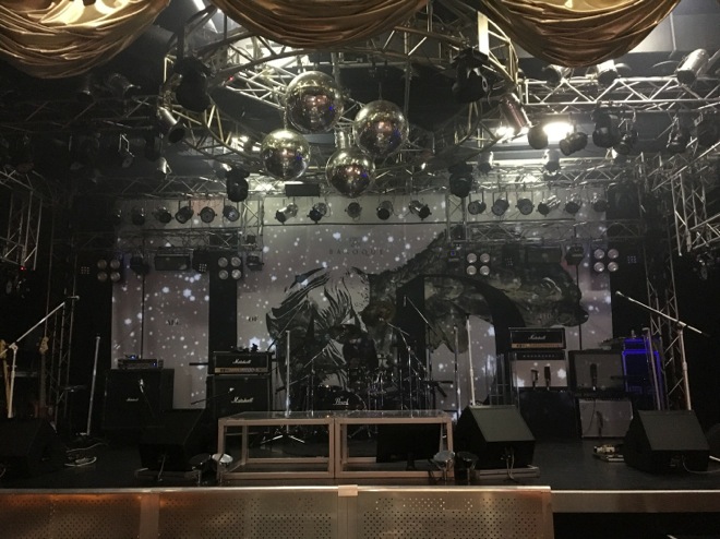 ここはステージ上にミラーボールが4つある会場。今ツアーの東京公演以外では、一番天井が高くて、大きな会場独特の音の響きが感じられました。到着すると既にステージ上は準備万端。