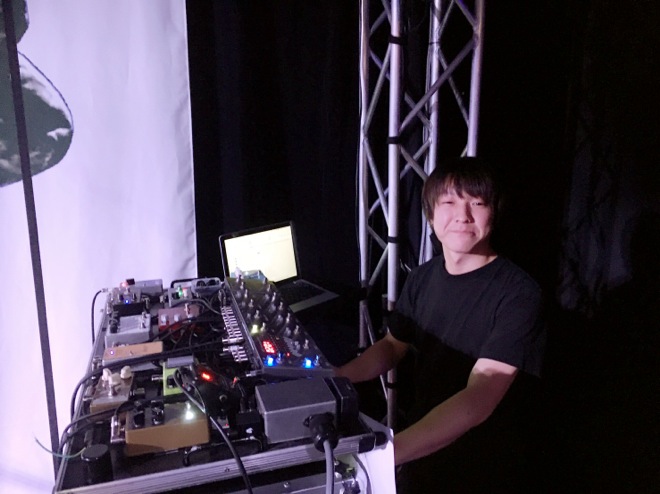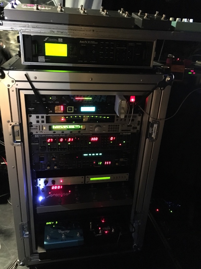 ステージ袖には僕の足元には置けない大量のエフェクター達がセッティングされています(下写真)。