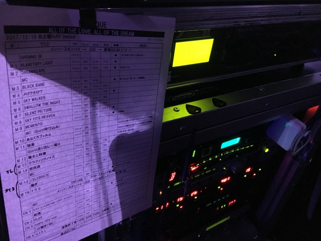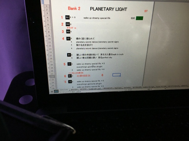 下の写真はギターテックの龍二。僕の隣には常に彼が居て、その都度、曲で使うギターを受け渡してくれたり、曲の中での音色をチェンジしてくれたりしています。どのタイミングで音色を切り替えるのか、全曲こうしてデータ化されています。
