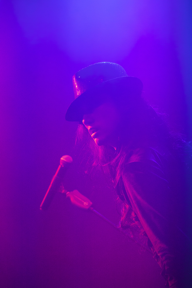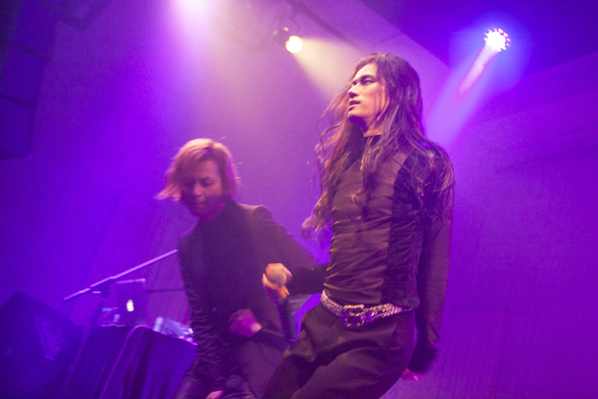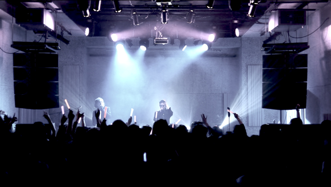 その後は、そこはかとなく漂う’80Sニューウェイブの香りが印象的な「DEAD OR DACE」と「L’Abime」を続けてプレイ。エッジィかつ重厚なシーケンス・サウンドとエモーショナルなボーカルのマッチングは独自の心地好さに溢れているし、エレガントさと“尖り”という相反する要素を兼ね備えたLEONEILには目を奪われずにいられない。さらに、スタイリッシュな立ち居振る舞いでサウンドを緻密に操り、安定したコーラス・ワークを行うYOW-ROWも本当に魅力的。華麗なオーラを放つ2人と高揚感を湛えたサウンドに牽引されて、場内の熱気はどんどん高まっていった。
