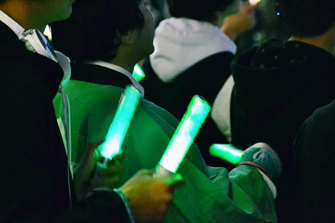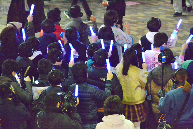 オープニングからアンコールまで鳴り止むことのない歓声と大合唱で盛況を極めたライブステージの模様を迫力のある大画面で観ることができるとあって、上映会場となるユニカビジョンを望む西武新宿駅前ペペ広場には、上映開始前から大勢のファンが集結。ユニカビジョンの上映イベントではお馴染みの、高音質サウンドで視聴できるヘッドフォン視聴イベントも行われた。上映会はスマホアプリ「 Another Track 」と連動しており、あらかじめアプリを DL して視聴の準備をしておくことで、上映中にアプリを起動したスマホを画面にかざすだけでスマホに接続したヘッドフォンから、上映中の映像にシンクロした高音質サウンドを聴くことができる(ヘッドフォンを使わず直接ビジョンから流れる音声も楽しめる)。先着 100 名様限定で高音質サウンドで視聴できるヘッドフォンの無料貸出も実施され、集まった人は開始前からヘッドフォンを受け取り、ビジョンを見上げてスタンバイをしていた。
