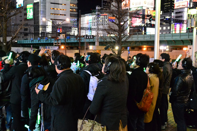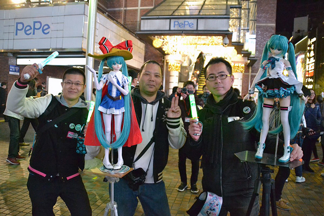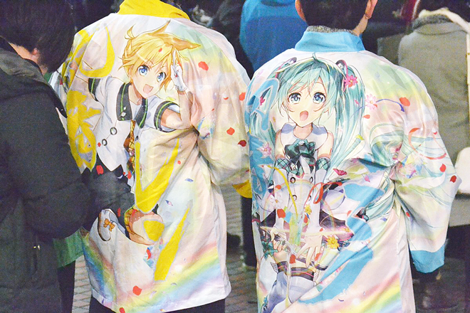 20時からの2回目には、会社帰りらしき人たちも加わり、ちょっとしたお祭りムードに。この回から駆けつけたらしき、推しのボーカロイドの法被に着替えたファンの姿も数人あり。先ほどよりも人数が増えた分、ライヴ感、一体感もアップしており、会場はライヴ幕張メッセと遜色ない熱量に包まれた。また、通りすがりらしい外国人も釘付けになって足を止め、スマホで周囲の様子を撮影するなど、帰宅時間と重なったこともありより一層注目を集めていた。ヘッドフォンをしたまま、ビジョンの中の初音ミクに向かいペンライトを振る多くの人の光景は、まるでサイレントディスコを見てるかのようで、シュールな面白さも感じられた。「脱法ロック」で先ほどよりも声を出してコーラスする人も多くなるなど、明らかに前回以上の盛り上がりぶりで、エンディングに向かい熱気はグングン上昇。寒空の下でのアツくエモいイベントとなっていた。上映会のラストは初音ミク、鏡音リン、鏡音レン、巡音ルカ、MEIKO、KAITOと、ボーカロイド総登場となったステージから、“フッ”と全員が姿を消し儚くも美しいエンディングで幕が下り、広場からは一斉に大きな拍手が沸き起こっていた。初音ミクを始めとするボーカロイドが、この10年にわたり多様な音楽性を体現してきたことがわかるこのライヴの模様を、ファンはどのように見つめていたのだろうか?早速、上映会に終了後に近くで盛り上がっていた3人組の男性ファンに話を訊いてみた。