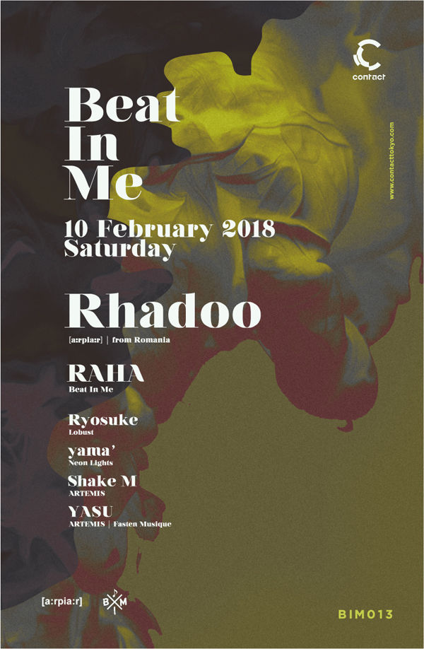 ゲストには、アンダーグラウンドシーン最高峰の1人として絶大な影響力のあるキング、Rhadooが満を持して登場。<Beat In Me>のパーティには今回で既に5回目の登場となるが、RPR SOUNDSYSTEMでの出演を含めた過去のプレイ全てがどれだけ最上級のものであったかは、未だ来場者の記憶の中に鮮明に残っているはずだ。Studioには加えてBIMレジデントのRahaが出演、Contactフロアには、Ryosuke、yama’、Shake M、YASUら国内トップクラスの手練が顔を揃える実に豪華な一夜となる。世界のダンスミュージックの最前線、そしてグルーヴをリアルに体感してほしい。
