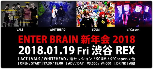 VALS、WHITEHEAD、SCUM、$”Casper. らが、1月19日(金) に渋谷REXで開催されるライブイベント<ENTER BRAIN新年会2018>に出演することがわかった。