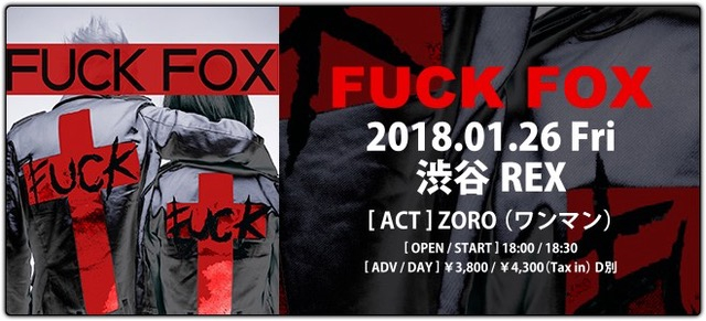 龍寺(vo.)とたつひ(ba.)によるバンド・ZOROが、2018年1月26日(金)に東京・渋谷REXで一夜限りのワンマンライブ<FUCK FOX>を行なう。