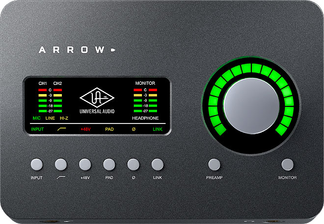「Arrow」は、デスクトップでの音楽制作に特化した高品位なオーディオインターフェイス。業務モデルのApolloシリーズ直系の製品ながら58,000円という低価格で登場した。堅牢なメタルボディに2イン/4アウト(ヘッドホン含む)の入出力を搭載。クラス最高の性能を誇るAD/DAコンバーターに加え、マイクプリアンプやギターアンプを完璧に再現するUnison (ユニゾン)マイクプリアンプを2基搭載。そして、業務用モデルと共通のUADプラグインを動作させることのできるDSPを1基搭載し、付属のUADプラグインを使ってコンピューターのCPUに負荷をかけることなくボーカルやターをほぼレイテンシーなしで掛け録りできるのが最大の特徴だ。