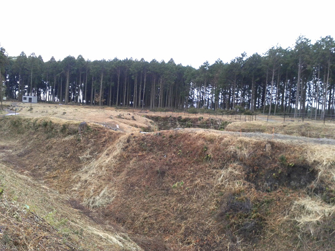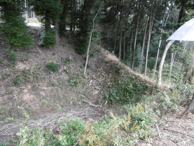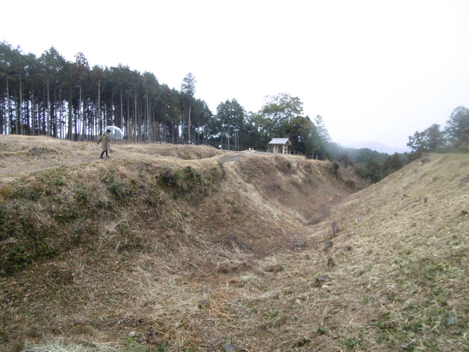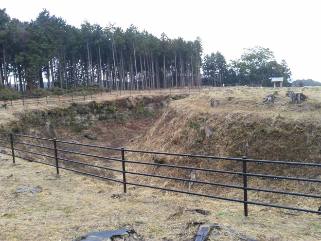 改めてお伝えするが何が凄いって三日月掘と丸馬出である。三日月堀と言えば武田氏と言ってもいいくらい、武田の城はこういった半径の丸い堀をよく用いる。敵を二つに分け両サイドを虎口にして敵を撃つシステムだ。その名の通り馬を待機させておくことにも使われたともいうし、攻めてくる敵を迎え撃つ為にこの馬出の中で兵士も戦ったとされる。諏訪原城にはなんと5つの丸馬出と3つの三日月堀がある。これがまず凄い。どこの城にもこんな数はないのだ。大概はあっても1つだ。しかも空堀が深い。7メートルはあるだろうか?近年の発掘調査でよっぽどこの凄まじさが垣間見れるようになった。感謝である。至る所に切り株があるがこれが今までは全部生えていたことを考えるとその凄さはなかなか伝わらなくても仕方ない状態だった。だがこれがなくなったことで見渡せるこの壮大な景色。半端ない。二の曲輪中馬出の先端に立ってあたりを見渡すとまさに武道館センターステージだ。武道館やったことないけど。二の曲輪大手馬出も同じだけの面積があるが諏訪神社が立っていることと木が切られていないこともあり、いまいち凄さが伝わらない。大手の周りを縁取る外堀もかなり深い、忘れた頃にやってくる摩天楼の縁取り〜傷だらけのエンジェ〜ルである。この周りに大手を正面して右に歩くと二の曲輪南馬出、二の曲輪東馬出も存在する。この両サイドにある東馬出と北馬出は端が崖になっていて竪堀の役目を果たしている。天然の要害を上手く利用した見事な作りである。そもそも諏訪原城の本曲輪の裏、搦手はほぼ崖になっており、大手からしか攻められない作りになっていることも凄い。その為にはこれだけの数の馬出が必要だったということだろう。諏訪原城は本曲輪を軸に大手に向かって扇子のような形をしている。いわゆる三角形だ。そのサイドのラインがソリッドで、崖になっているだなんて、まさに浮き出たパンティライン。岡本夏生のバブル期かもしれない。しれないってなんだよ。