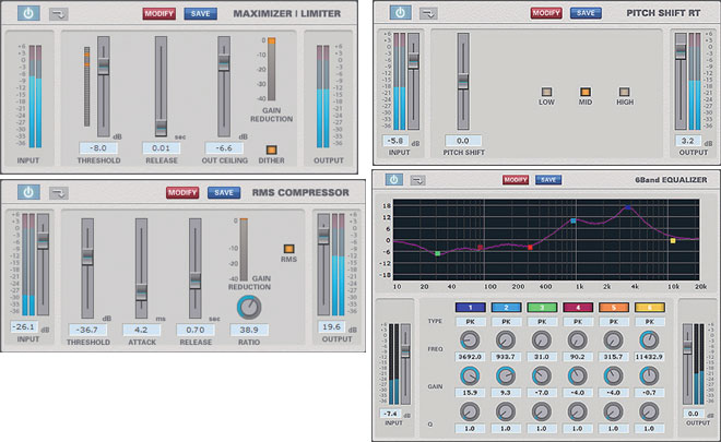 ▲新たに4種類のVSTプラグインを追加。上段左からMaximizer、PitchShift RT、下段はRMS Compressor、6Band EQ。