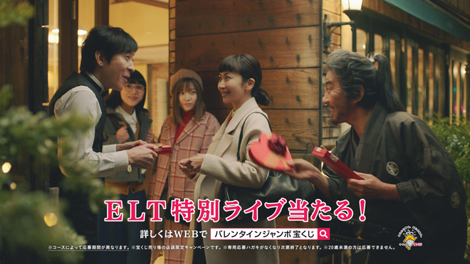 「バレンタインジャンボ宝くじ」および「バレンタインジャンボミニ」の新登場に合わせて放映される今回のCMでは、「ジャンボ宝くじ」CMキャラクターの役所広司、島崎遥香とELTの二人による共演が実現。持田は役所演じる“侍”のバレンタインデートの相手役、伊藤は彼らがディナーを楽しむレストランのウェイター役として登場する。