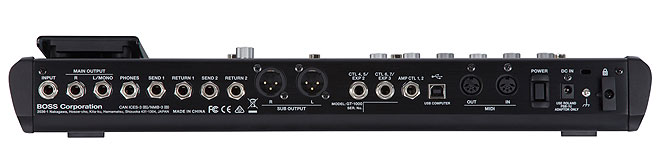 ▲リアパネルには標準フォーン、XLRの出力端子に加え、2系統のSEND/RETURN、MIDI入出力、USB、ヘッドホン出力、各種コントロール用の端子を用意。