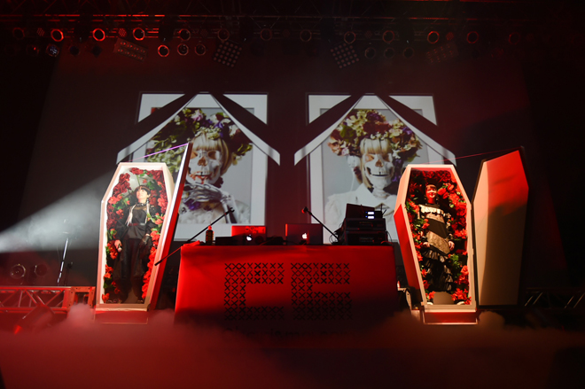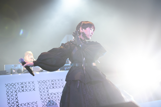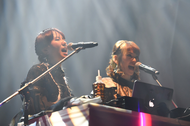 「999」のあと、最初のMCへ。いつかは「ようこそお越しくださった。終わりにして始まりのライブ、みんな準備できた?」と挨拶。頭上で手のひらを合わせる“とんがりポーズ”をするよう観客に促すと、フロアの光景を前に「あれ、今日は従順だね!」と上機嫌で反応し、そのまま「とんがりヤング」をスタートさせた。そこから「Like it」「ペインオフ」「AUTOMADE」「メンヘラブス」と間髪入れずに連投。各曲はフルサイズではなく、曲の一部分同士をテンポよく繋げていくような構成だ。ベストアルバムには収録されていない初期の楽曲を含んだ選曲は、観客を大いに喜ばせていた。また、いつかがDJブースに移動し、二人が横並びになった状態でのパフォーマンスとなった「NOW Remix」「等身大グレー」「ジェンガジェンガ」「LOOKER」「ベルサッサ」もメドレー形式で披露。ステージ後方のスクリーンや舞台セットの棺桶には映像が投影され、まるでプロジェクションマッピングのような状態に。彩り豊かな空間で繰り広げられたノンストップのダンスタイムは、観客を一層熱狂させていった。