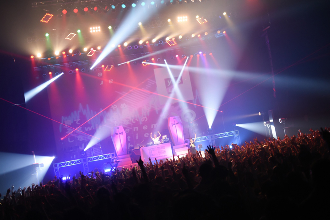 おなじみのDJブースの両隣にある真っ白な棺桶、上空に浮かぶ骸骨姿のいつか(MC)とゴンチの遺影、おどろおどろしいBGMが異様な雰囲気を演出するなか、場内は暗転した。SEとして流された木魚の音がダンサブルなビートに変わったところで棺桶の蓋が開き、真っ黒な衣装を纏ったいつか、ゴンチが登場した。1曲目は、ベストアルバム『Charisma.BEST』に初収録された新曲「りぼん」。歌詞に合わせて中指を立てるいつかに早速歓声が集まっていく。観客の手拍子とともに突入した「お局ロック」では、真っ赤な脚立がステージに運び込まれ、いつかがそれにもたれたり上ったりしながらパフォーマンスした。