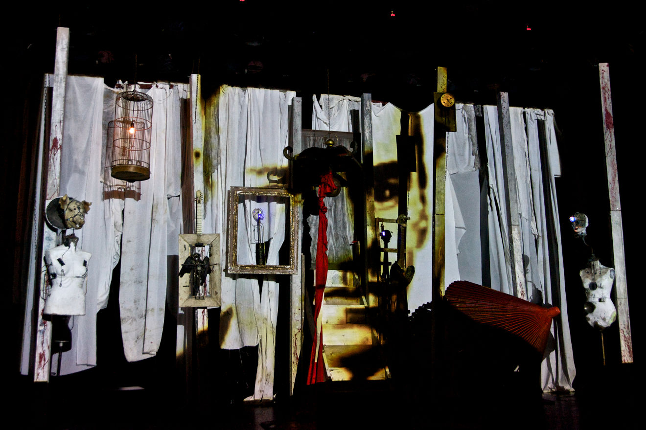 第二公演はステージに神社の鳥居を作り、中央に鈴と赤い傘。神話的な要素を取り入れた。初回公演は足下が寂しかったのでこの回では1枚の大きな龍の絵を置いた。