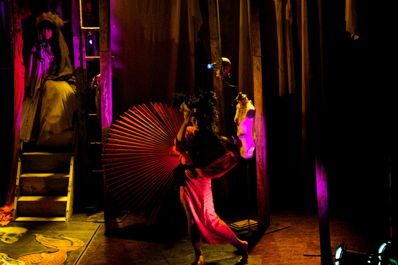 前回の春公演から一転、夏公演では和のイメージが全篇に散りばめられた。篠笛や和太鼓などの音が要所で耳に入ってくる中、光と陰を巧みに使ったステージは6月らしい湿度と、どこかひんやりした心地よさを感じさせる。空間演出はマンタム、衣装デザインは市川大輔。