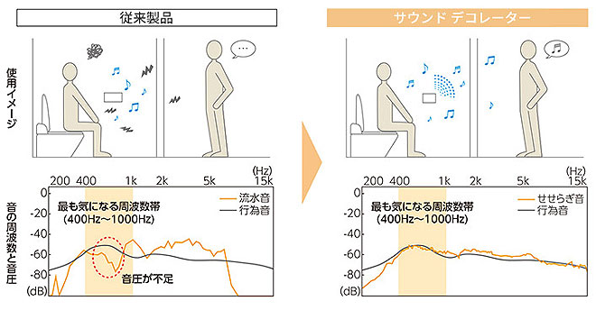 使用時の音を人に聞かれたくないというニーズで一般的になりつつあるトイレ用音響装置。しかし、従来の装置は、録音したトイレの流水音などを再生してトイレ使用時の音を隠すというもので、「聞かれたくない」という悩みが十分に解消されたわけではなかった。そこで登場したのが、「サウンドデコレーター」だ。
