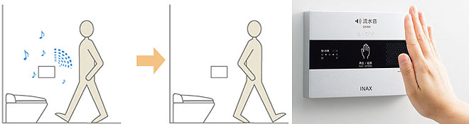 ▲トイレ用音響装置「サウンドデコレーター」(左)とその施工例(右)。