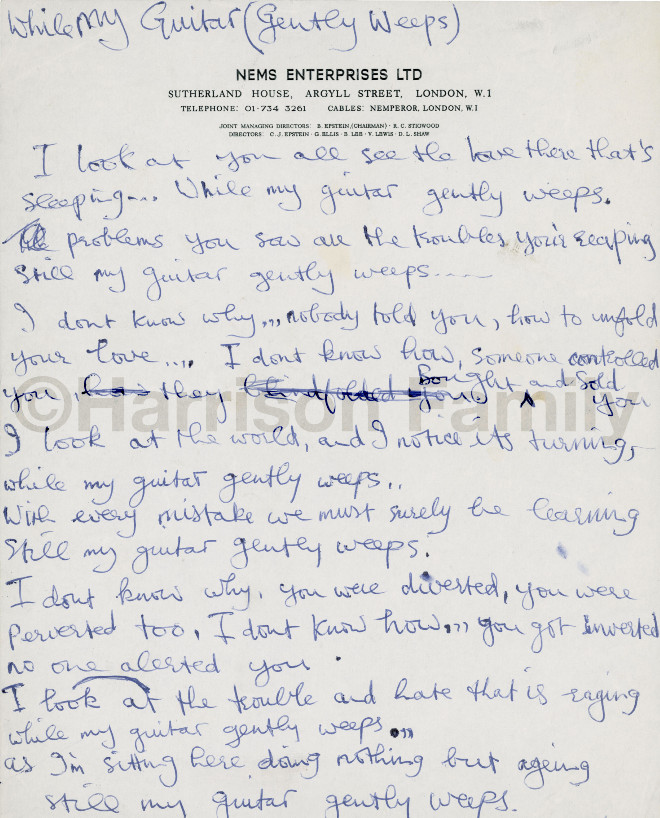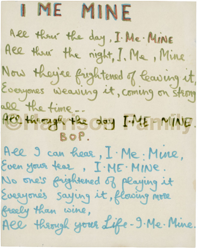展示される作詞原稿は、展覧会のタイトルにもなっている「I Me Mine」をはじめ、「While My Guitar Gently Weeps」「Here Comes the Sun」などビートルズ時代の代表曲から、「My Sweet Lord」「All Things Must Pass」など解散後の楽曲までを含む22点だ。2017年にその存在が明らかになり話題を呼んだ、リンゴ・スターについて書かれた未発表曲「Hey Ringo」もお目見えする。原稿には歌詞にまつわる自身の解説も添えられ、その筆跡とともにそれぞれの楽曲の創作過程をたどることができる。