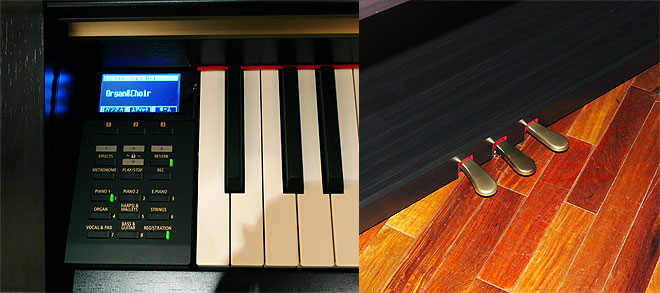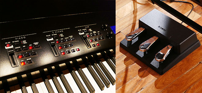▲PIANO、E.PIANO、SUBとセクションごとに分けられた操作パネル(左)と新開発のペダル(右)。