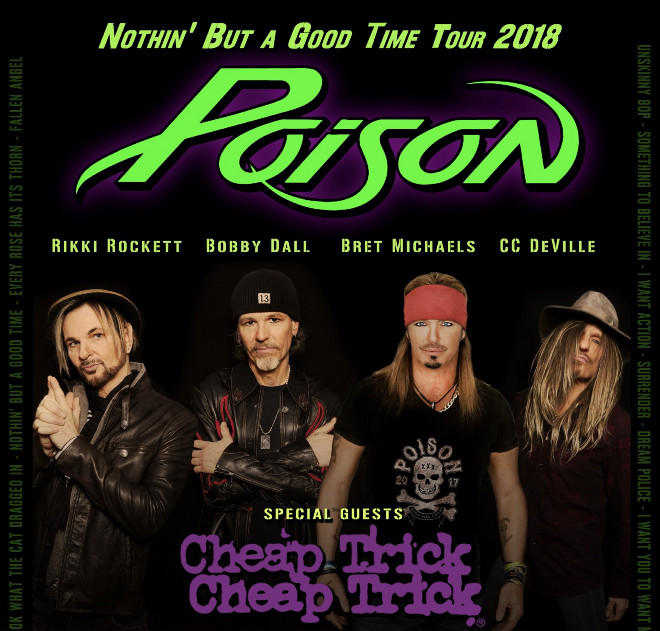ポイズンは、ブレット・マイケルズ(Vo)、C・C・デヴィル(G)、ボビー・ダル(B)、リッキー・ロケット(Ds)のオリジナル・ラインナップ。マイケルズは「オール・オリジナルのポイズンがこの夏、再びヘッドラインを飾る。コンサートとパーティーを合体したメガなものになるだろう。俺ら、ヒット曲全てをプレイし、ハイ・エネルギーなロックンロールのグッド・タイムをもたらすつもりだ。約束する、これは凄いことになる。俺の友人、チープ・トリックとPop Evilが一緒だ。いくつかの公演ではほかにもスペシャル・ゲストがいる。どのバンドもヒット曲をプレイし、1000%の力を出す!!!」「もう一度誓うぜ、C・C、ボビー、リッキー、俺はNOTHING BUT A GOOD TIME(グッドタイムのみ)をもたらす!!!」と、コメントしている。