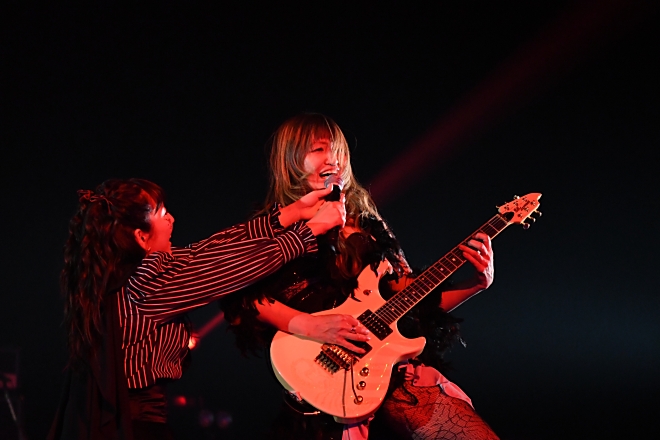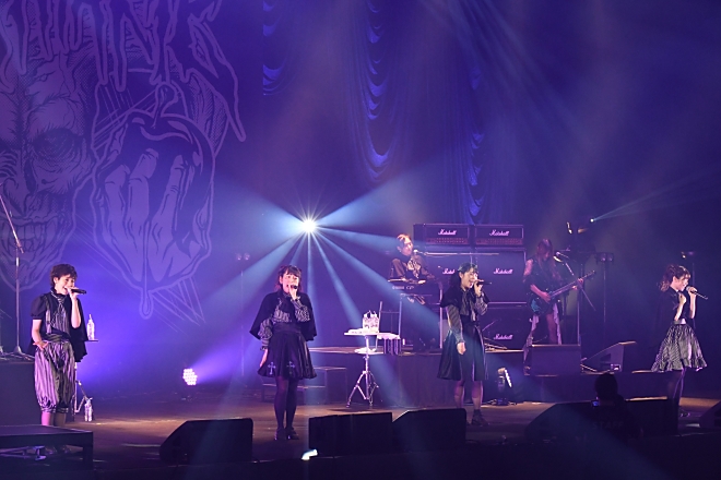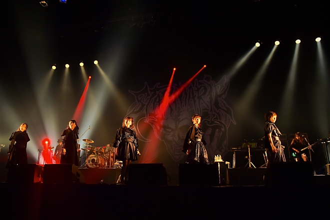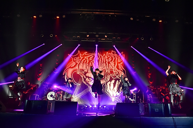 公演を通して1つの物語や世界を表現するSTARMARIEらしく、この日も物々しい音楽に乗せた怪しげなナレーションとともに舞台の幕が上がる。前回の中野公演で見せたファンタジックな舞台セットから一転、悪魔のモチーフとメタル調のロゴアートをあしらった巨大なバックドロップという、まるでロックバンドのようなシンプルなセット演出に異変を感じ取った観客もいたことだろう。SHOW-YAのギタリスト五十嵐☆sun-go☆美貴率いるバンド隊が現れ、最後に凛と立つSTARMARIEの5人のメンバーが暗闇の中にシルエットを浮かび上がらせた。1曲目から「悪魔、はじめます。」のドライブ感溢れるロックサウンドがホール全体に響き渡り、黒い衣装をひるがえらせながらSTARMARIEが攻撃的な振り付けでステージに舞う。“現代社会に潜むストレスや闇を包み隠さずさらけ出して悪魔になる”という痛快な皮肉を込められた楽曲を歌い上げるその姿は、世間が持つ“アイドルSTARMARIE”へのイメージを序盤から崩壊させる。
