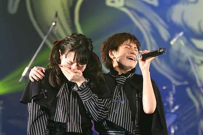 深々とお辞儀をし、STARMARIEの全メンバーが袖にはけていった後、ステージの両サイドからゆっくりと現れたのは渡辺楓と中根もにゃ。「賢者のローブ」を二人だけで、時に互いに見つめ合いながら力強く歌い上げ会場からは大きな拍手が贈られた。公演も終盤に差し掛かり、「狂おしき月下の舞踏会」「かけおちしようよ」「涙のパン工場 「コンセル・カマタ」」を畳み掛けるように繰り出す。