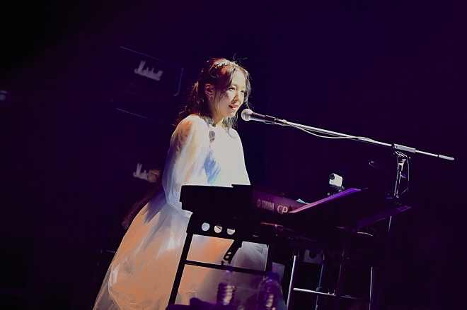 ライブ後半戦では暗転した漆黒のステージに、一人麗しいブルードレスに袖を通した高森紫乃が現れ、ピンスポットの中深々とフロアへお辞儀をし、ピアノソロを披露。会場中がその美しい音色に聴き惚れる。