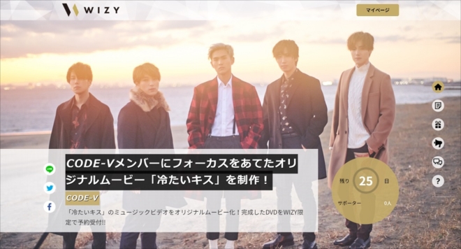 「WIZY」ではCODE-V メンバーにフォーカスをあてたスペシャルオリジナルムービーをDVD化し、WIZY限定で予約受付。また、撮影時にエキストラとして出演したり、メンバー全員のサイン入り台本など個数限定のアイテムを手に入れることもできる。さらにサポーター数に応じてメンバーからのお礼動画、DVD収録映像をスマホでも楽しめるプレイパスサービスへの対応など、アイテムのアップデートも予定されているとのこと。追加アイテムとして、メンバーと一緒にいち早くオリジナルムービー本編を観ることができ、メンバーから直接DVDが渡される「完成披露試写会」の開催も予定されている。