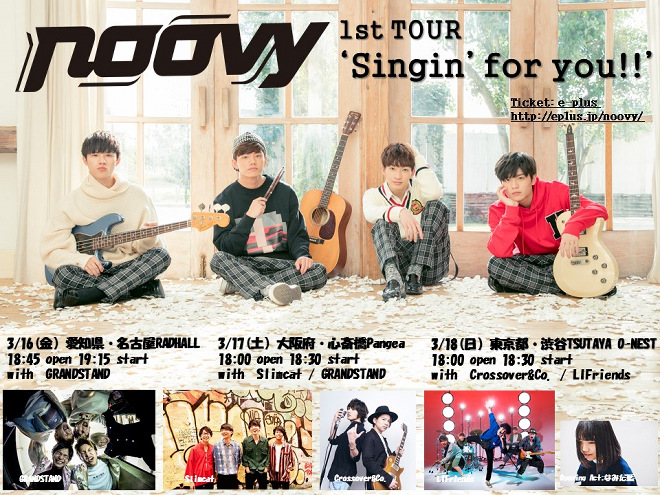 東名阪での開催となる本ツアーだが、ゲストアクトは2017年に100本以上のライブを経験したnoovyがライブ活動の中でつながったバンドを中心に決定。名古屋RADHALLではGRANDSTAND、心斎橋PangeaではSlimcatとGRANDSTANDが、そして渋谷TSUTAYA O-NESTではCrossover&Co.、LIFriendsとオープニングアクトになみだ藍が出演する。チケットはe-plusにて販売中。