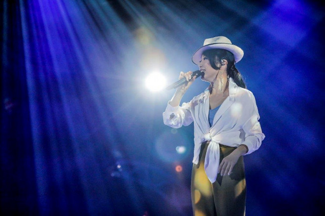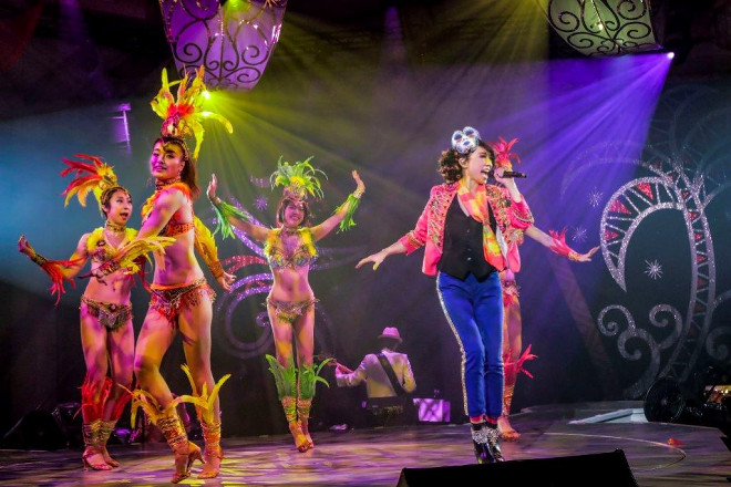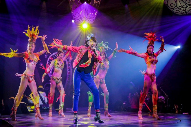 「私なしでも」「110°F」とノンストップで駆け抜け、ステージに腰を下ろして「曇り空」をしっとりと聴かせると、続く5曲目「Blue Rain Blue」ではステージ上で早着替えを披露。曲終わりでダンサーが左右からポンチョ風の衣装をひっぱると、さらにゴールドのドレスに衣裳が替わり、観客がドッと湧く。