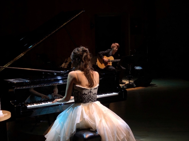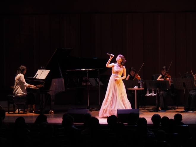 May J.は1曲目にジャズのスタンダードナンバー「Fly Me To The Moon」、2曲目に「You’d be so nice to come home to」を披露。ピアノとギターのみのシンプルな編成で、しっとりと歌い上げる。さらにカルテットを呼び込み、バイオリン、ビオラ、チェロ、ピアノ、ギターという編成でコンサートが続く。