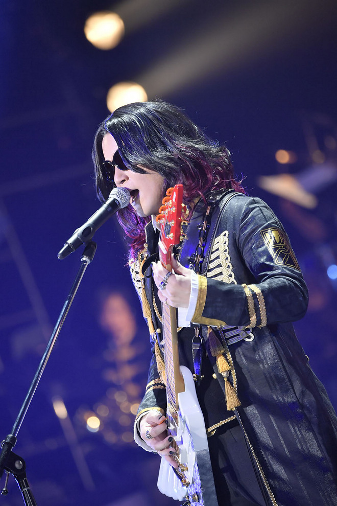 そしてここからは「僕もギターを弾いてみたいと思います」とRevoが翼モチーフのフライングV“Flying Freiheit”を手に取り、「『進撃の巨人』の調査兵団の応援歌のつもりで作ったんですが、こうしてライブでやる今、皆さんへの応援歌として、皆さんの未来の栄光を歌う曲として歌いたいと思います」と語る「自由の翼」へ。凱旋に相応しいイントロから転調し、怒涛のサウンドで鼓舞してくる展開にはわかっていてもカッコ良さに唸らされた。