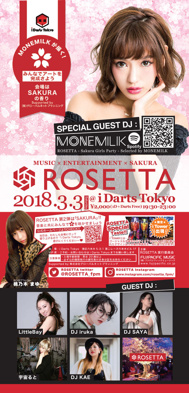ROSETTAは“MUSIC × ENTERTAINMENT × ??”を掲げ、2017年産声をあげたイベントで、<バレンタイン・Chocolate>をテーマに第一弾が開催され、会場のELE TOKYOはバレンタインムードに包まれ男女の出会いを盛り上げた。第二弾のテーマは<SAKURA>。会場となるi Darts Tokyoはサクラ一色に染まり、一足先にお花見モードとなる。